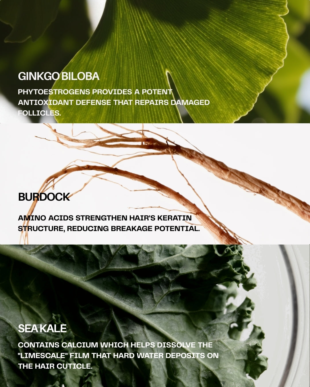 Powered by revitalizing Ginkgo Biloba, fortifying Burdock Root, marine-sourced Sea Kale, and ultra-nourishing Argan Oil, this creamy, lightweight conditioner deeply nourishes, softens, and restores shine, without buildup. It smooths frizz, strengthens weak strands, and enhances softness for hair that feels instantly more manageable, resilient, and radiant.